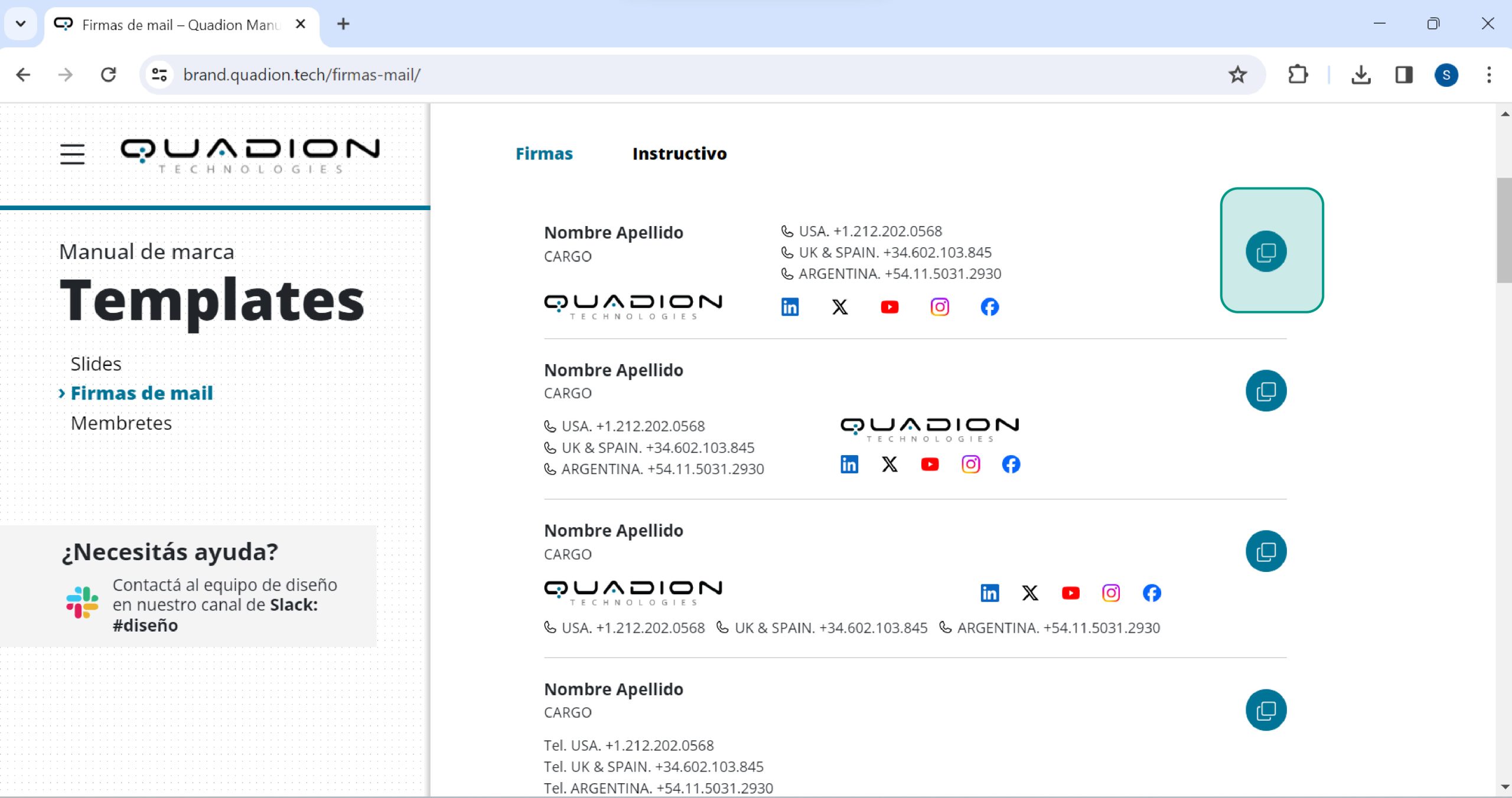 Los correos enviados desde la casilla de Quadion deben estar acompañados por el logo de la empresa y los medios de contacto de la misma, además de los datos (Nombre, Apellido y cargo) de quien envía el correo.