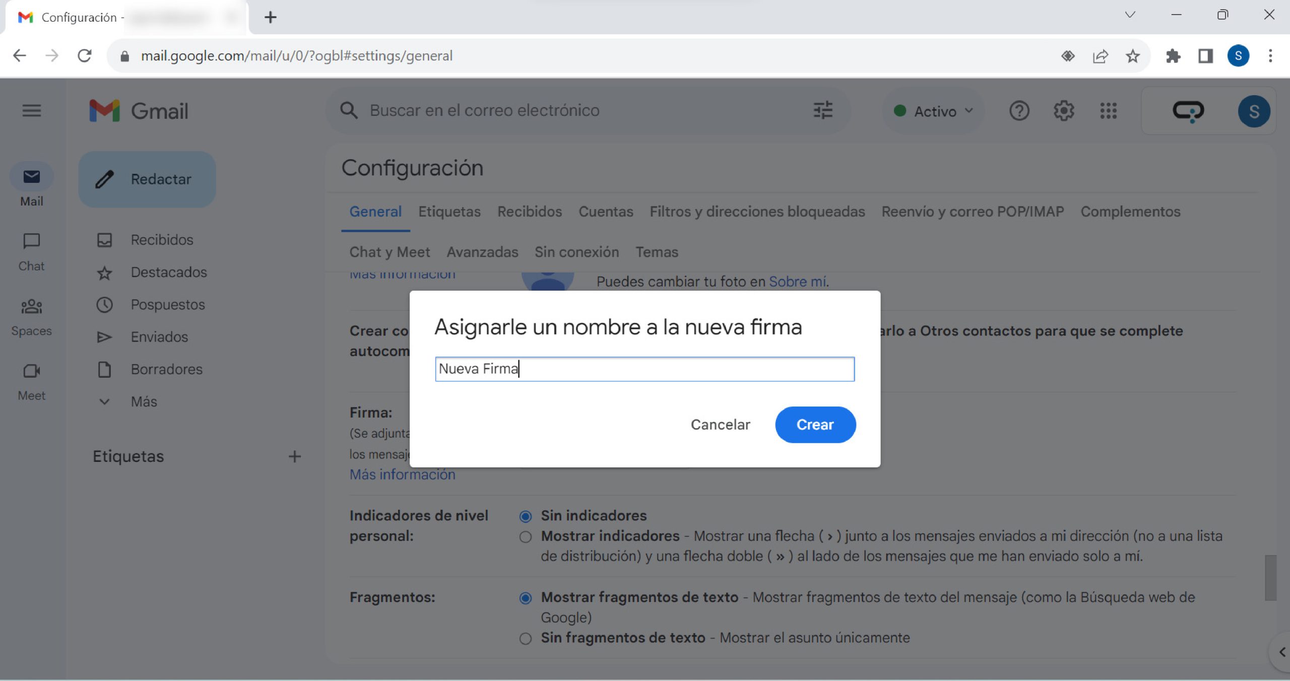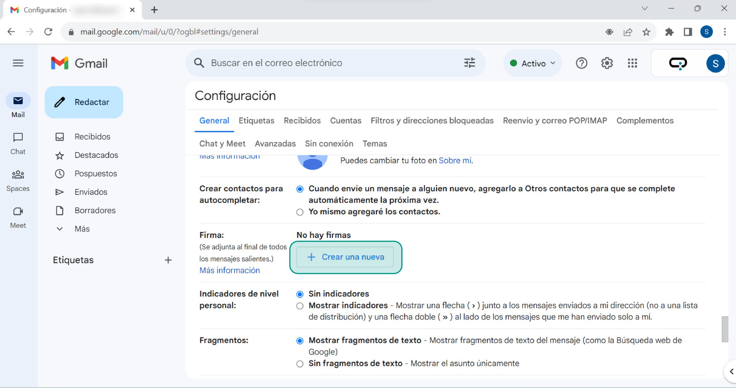 En la solapa General buscá la sección Firmas y hacé click en Crear una nueva .
